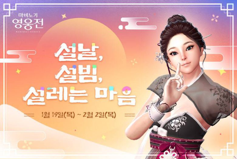 ‘마비노기 영웅전’에서는 설 명절을 맞아 2월 2일까지 게임에 접속하면 하루에 한 번 ‘[설레는 설날 선물 상자]’를 지급한다. 상자 개봉 시 캐릭터 성별에 따라 다양한 스페셜 아바타를 착용할 수 있는 ‘[설날 설빔 선택 상자]’와 교환상점에서 ‘실험용 아바타 염색 앰플’, ‘타이틀: 설레는 새해를 맞이하며’, ‘여신의 항해 축복석’ 등과 교환할 수 있는 ‘[설레는 설날 쿠폰]’, 새해의 운을 점쳐보고 일정 시간동안 캐릭터에게 능력치 상승 효과를 제공하는 ‘[설맞이 운세 부적]’을 얻을 수 있다.