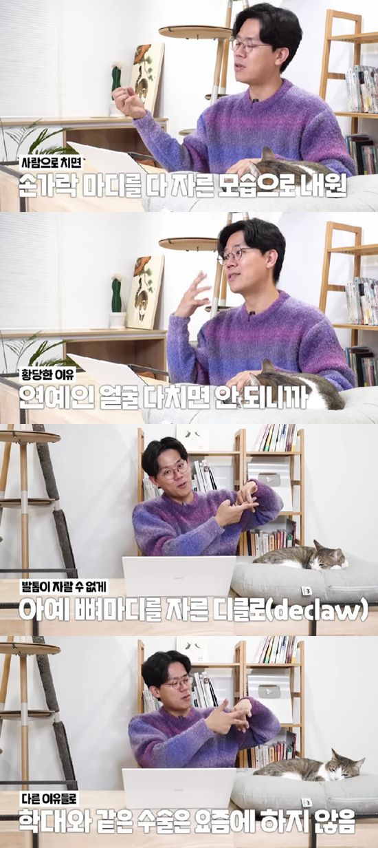 김명철 수의사는 "단 치료 목적인 경우도 있다. 발톱이 빠졌는데 나는 과정에서 계속 상처가 나서 치료가 안 될 때는 치료 목적으로 마지막 마디를 자르는 수술을 한다"면서도 "그런데 (유명 연예인의 반려묘의 경우에는) 가구가 망가지는 것이나 사람이 긁히는 걸 막기 위해서 발가락 끝마디를 다 자른 것이다. 생각하니까 갑자기 화가 난다"고 말했다.