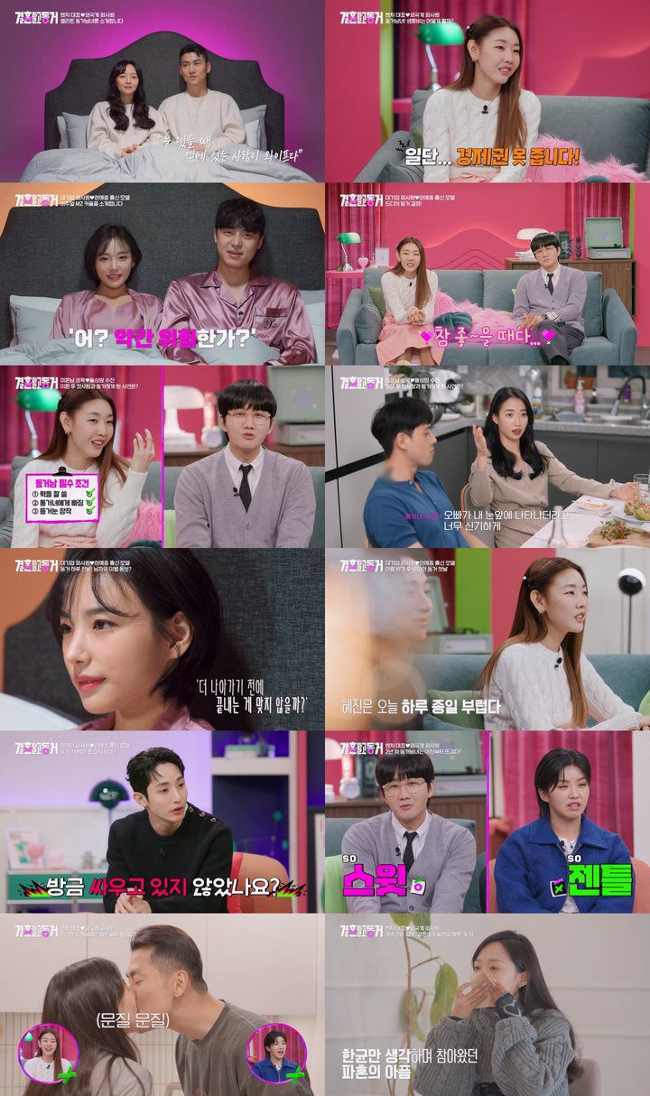 [서울=뉴시스]장인영 인턴 기자 = 채널A 동거 관찰 러브스토리 '결혼 말고 동거'가 1~2회 첫 방송을 선보였다. 한혜진·이용진·아이키·이수혁 4MC는 "위험하고 아찔하다"며 각기 다른 사연을 가진 세 쌍의 동거 커플을 지켜봤다.