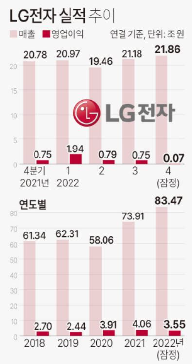 LG전자는 지난해 4분기 연결기준 매출과 영업이익을 각각 21조8597억 원, 655억 원으로 잠정 집계했다. 2021년 4분기보다 매출액은 5.2% 증가했으나 영업이익은 91.2% 급감했다.