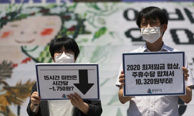 2020년 6월9일 최저임금 심의를 앞두고 청년유니온이 서울 종로구 세종문화회관 앞에서 기자회견을 열어 최저임금위원회가 주휴수당을 기본급화 하고 초단시간 노동자에 대한 불합리한 차별 해소에 나설 것을 촉구했다. 이종근 기자 root2@hani.co.kr |