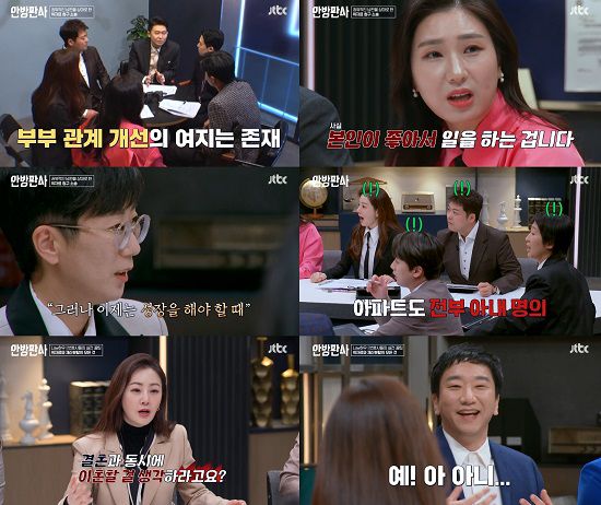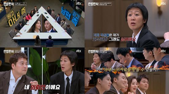 24일 첫 방송된 JTBC 예능 프로그램 '안방판사'는 누구도 정확히 따져주지 못했던 삶 속의 크고 작은 모든 갈등에 법적 잣대를 들이대 보는 본격 법정 예능 토크쇼로, 첫 번째 소송에는 8년 차 부부의 갈등을 다뤘다.