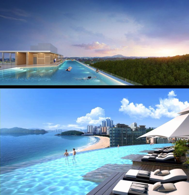 옥상에 인피니티풀이 있는 신축 아파트들이 생겨나고 있다. 사진(위)은 개포 자이 프레지던스와 부산 엘씨티 더샾 인피니티풀 조감도./제공=각각 GS건설, 포스코건설 |