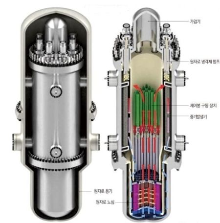 원전 내부에서 원자로 압력용기(좌)는 핵심적인 역할을 한다. 내부에는 핵심 장비들이 있다. / 사진=머니투데이DB