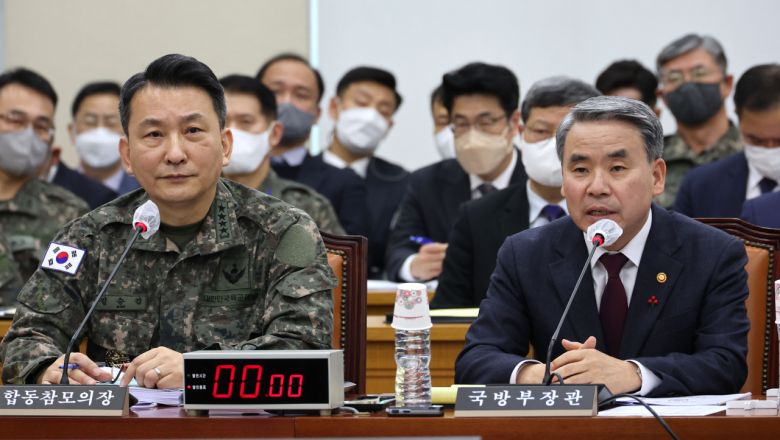 유◇엔군사령부는 26일 북한 무인기의 지난달 대한민국 영공 침범과 함께 이에 대응한 한국군 무인기의 비무장지대(DMZ) 이북 전개에 대해서도 정전협정 위반이라는 입장을 밝혔다. 이종섭 국방부 장관(오른쪽)과 김승겸 합참의장이 이날 국회 국방위원회 전체회의에서 북한 무인기 관련 질의에 답변하고 있다. [연합]