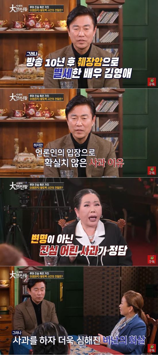 이영돈은 "그게 문제가 아니었다. (故 김영애가) 방송 10년 후에 (췌장암으로) 돌아가셨다. 이 부분에 적절히 사과하긴 했다. 그런데 팩트를 가지고 방송한 사람의 입장에서 뭐 때문에 사과해야 하는지 불분명했다. 또 뭘 사과를 하냐며 비난이 심해졌다. 만약 그때로 돌아가면 방송하지 말라고 했을 거다"라고 토로했다.