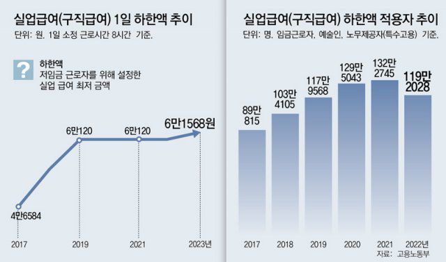 고용부에 따르면 지난해 실업급여 수급자는 163만1270명이다. 경기 침체 우려가 커지는 가운데, 직장에서 해고당하는 사람들을 위한 사회 안전망 차원에서 실업급여는 필요한 제도로 꼽힌다. 다만 전문가들은 ‘하한액-최저임금 연동’ 방식 등 현재의 시스템은 개선이 필요하다고 지적한다. 유길상 한국기술교육대 명예교수는 “실업자 생계 안정은 보장하되 수급 요건과 재취업 활동 인정을 더 까다롭게 만들어서 정말 필요한 사람만 받을 수 있도록 해야 한다”고 말했다. 정부는 고용보험위원회 내 제도 개선 태스크포스(TF)에서 상반기(1∼6월) 중 개선안을 내놓을 방침이다.
