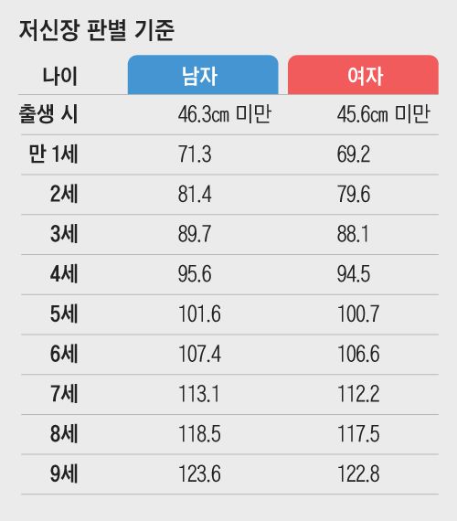 저(低)신장의 의학적 정의는 ‘같은 성별의 또래 100명 중 3번째 미만일 때’ 또는 ‘신장 표준점수가 -2 미만일 때’이다. 대략 또래 평균보다 10㎝ 이상 작거나, 1년 동안 4㎝ 이하로 자란다면 저신장의 가능성이 높다<표 참조>.