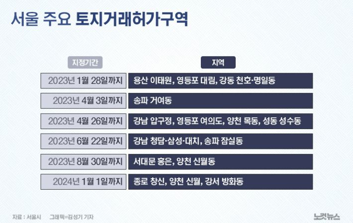 앞서 서울시는 2020년 6월 국제교류복합지구 및 인근 지역인 강남구 청담·대치·삼성동, 송파구 잠실동을 토지거래허가구역으로 지정한 데 이어, 2021년 4월에는 주요 재건축 단지가 밀집한 강남구 압구정동과 영등포구 여의도동, 성동구 성수동, 양천구 목동 일대를 토지거래허가구역으로 지정했다. 신속통합기획 재개발 후보지와 공공재개발 후보지 등도 대상이 됐다. 이들 지역은 1년 단위로 토지거래허가구역 지정이 연장돼 왔다.