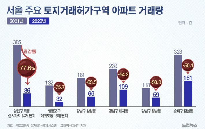 실제로 토지거래허가구역으로 지정된 목동신시가지 아파트 14개 단지는 2021년 385건이 거래됐지만, 지난해에는 77.7% 감소한 86건만 거래되는게 그쳤고, 잠실동 역시 거래량이 급감(323→161건)했다.