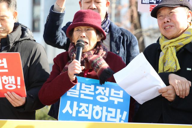 ▲17일 광주 동구 5·18민주광장에서 일제 강제동원 피해자인 양금덕 할머니와 역사를 지키는 광주 시민사회단체 일동이 기자회견을 열고 제3자인 일제강제동원피해자지원재단 재원으로 판결금을 대신 변제받도록 하는 정부 배상안에 대해 반발하고 있다. ⓒ연합뉴스
