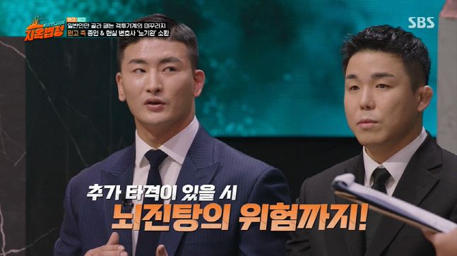 26일 첫 방송된 SBS ‘이상한 나라의 지옥법정’에는 로드FC 전 라이트급 챔피언 권아솔(36)과 MAX FC 전 헤비급 챔피언 명현만(37)이 출연했다.