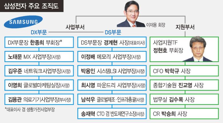 이미 “정 부회장을 견제할 사람이 사실상 없다”는 평가가 나온다. 김기남 회장이 부회장 시절 디에스(DS)부문장을 맡고 있을 때는 정 부회장(당시는 사장)보다 나이가 2살 많고 직책도 높아 사업지원티에프 ‘지시’에 맞서기도 했지만, 현재는 누구도 그러지 못하고 있다는 것이다. 한종희 부회장(디엑스(DX)부문장)은 2020년 말 정 부회장과 함께 승진했고, 경계현 사장(디에스부문장)은 직급이 한 단계 낮다.