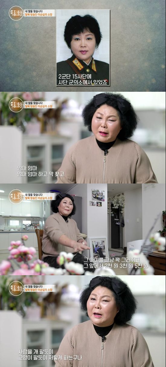홀로 탈북하게 된 이순실은 다시 만날 딸을 위해 막노동을 서슴지 않았다고. 방송에 열심히 출연한 것도 자신의 사정을 알려 딸을 찾기 위함이었다. 이순실은 "애를 찾으려면 돈이 없으면 못 찾는다. 돈이 있어야 사람이 움직인다"고 털어놨다.