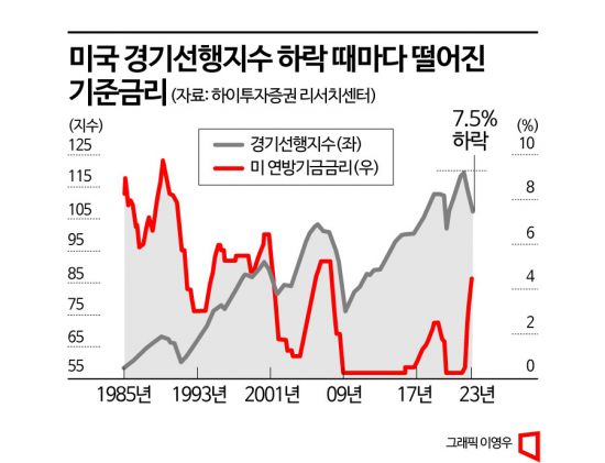 이에 대한 근거로 최근 미국의 경기선행지수가 하락하고 있다는 점을 들었다. 박상현 하이투자증권 투자전략부 연구원은 "미국 경기선행지수의 하락은 미국의 경기가 침체 국면에 진입하고 있다는 것을 의미한다는 점에서 미 Fed의 금리 인상 사이클에도 큰 영향을 미칠 수밖에 없다"라며 "(과거에도) 경기선행지수 증가율(전년 동월 기준)이 하락 전환할 경우 Fed는 어김없이 금리 인상을 중단하거나 금리를 인하했다"고 설명했다.