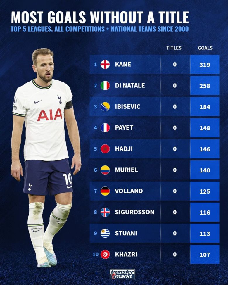 우승복이 유난히 따라주지 않은 케인에게 결국 굴욕적인 기록이 따라붙었다. 21세기 이후 유럽 5대리그 소속 무관 선수 중 최다 득점 기록이다.