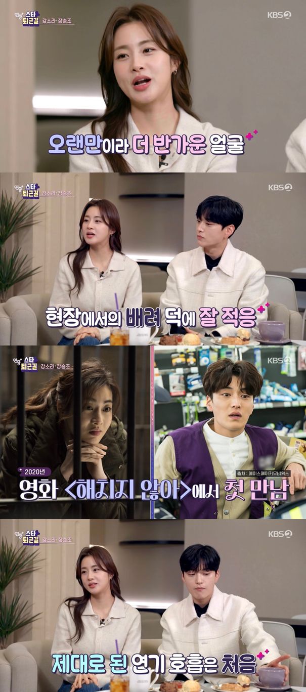 두 사람은 지난 2020년 영화 '해치지 않아'에서 함께 출연한 바 있다. 강소라는 "영화에서 짧은 장면에서 만나긴 했었다. 제대로 연기 합을 맞춘 거는 이번이 처음"이라고 답했다.