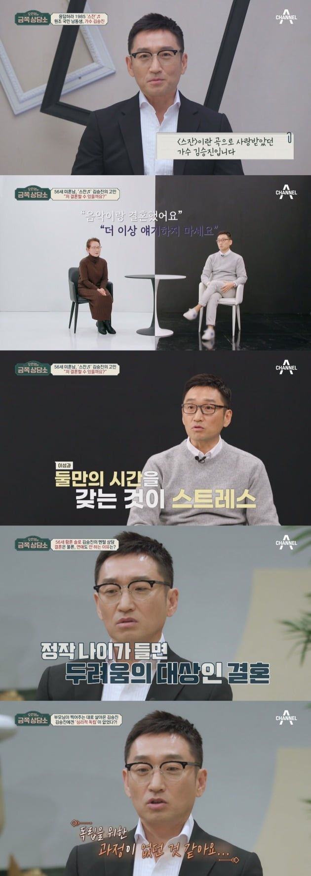 감미로운 목소리로 열창했던 데뷔 앨범 ‘스잔’을 통해 가요계를 휘어잡았던 김승진이 상담소 문을 두드린다. 김승진의 어머니는 올해 56세임에도 결혼하지 못한 아들이 고민이라 토로한다. 이에 김승진은 “음악과 결혼했다, 더는 얘기하지 말라”고 답해 결혼에 있어 상반된 모자(母子)의 생각이 수면 위로 드러난다.