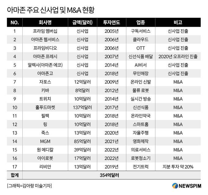 앤디 제시의 M&A 쇼핑 한계금액은 얼마일까? 창업자인 제프 베조스가 물러나면서 CEO를 맡은 앤디 제시는 M&A쇼핑에 어마어마한 돈을 쓰고 있다. 제프 베조스가 직접 실행한 홀푸드마켓 인수가격이 16조4천억원(137억달러)으로 아마존 M&A 사상 최대 가격이었다면 앤디 제시가 2021년에 영화제작∙배급사인 MGM 인수에 사용한 10조원(85억달러)은 사상 2번째로 큰 금액이다.