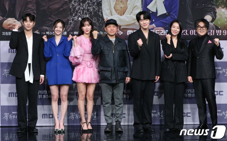 배우 안우연(왼쪽부터)과 김다솜, 임수향, 백수찬 PD, 김정현, 김인권, 차청화가 27일 오후 서울 마포구 MBC 골든마우스홀에서 열린 MBC 새 금토드라마 '꼭두의 계절'(극본 허준우) 제작발표회에서 포즈를 취하고 있다. '꼭두의 계절'은 99년마다 인간에게 천벌을 내리러 이승에 내려오는 사신(死神) 꼭두(김정현 분)가 신비한 능력을 가진 왕진의사 한계절(임수향 분)을 만나 벌이는 판타지 로맨스물이다. 2023.1.27/뉴스1 ⓒ News1 권현진 기자 |