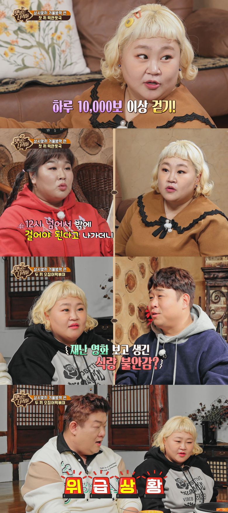 하지만 이도 잠시, 김민경이 "12시가 넘은 시간에 밖으로 나가서 '핫'하다는 빵을 사오는 영상을 SNS에 올렸던데"라고 폭로했고, 이를 들은 문세윤이 "넌 삼시 세끼만 먹고 간식만 줄여도 40kg는 빠진다"고 거들어 모두를 웃게 했다.