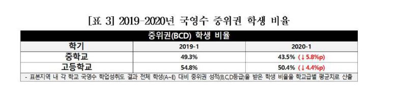 2019년과 2020년 국영수 중위권 학생 비율을 비교한 표, 출처=사교육걱정없는세상 |