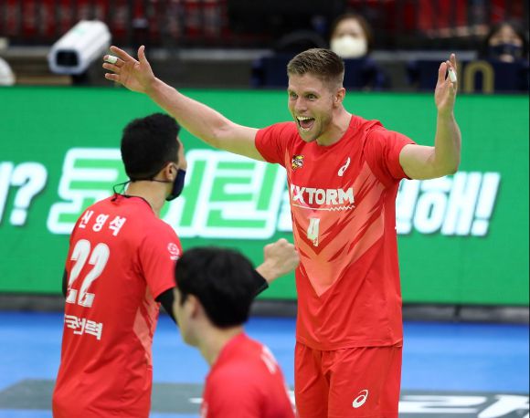 한국전력 타이스(오른쪽)가 지난 15일 열린 우리카드와 홈 경기 도중 공격 성공 후 팀 동료들과 함께 환호하고 있다. [사진=발리볼코리아닷컴]