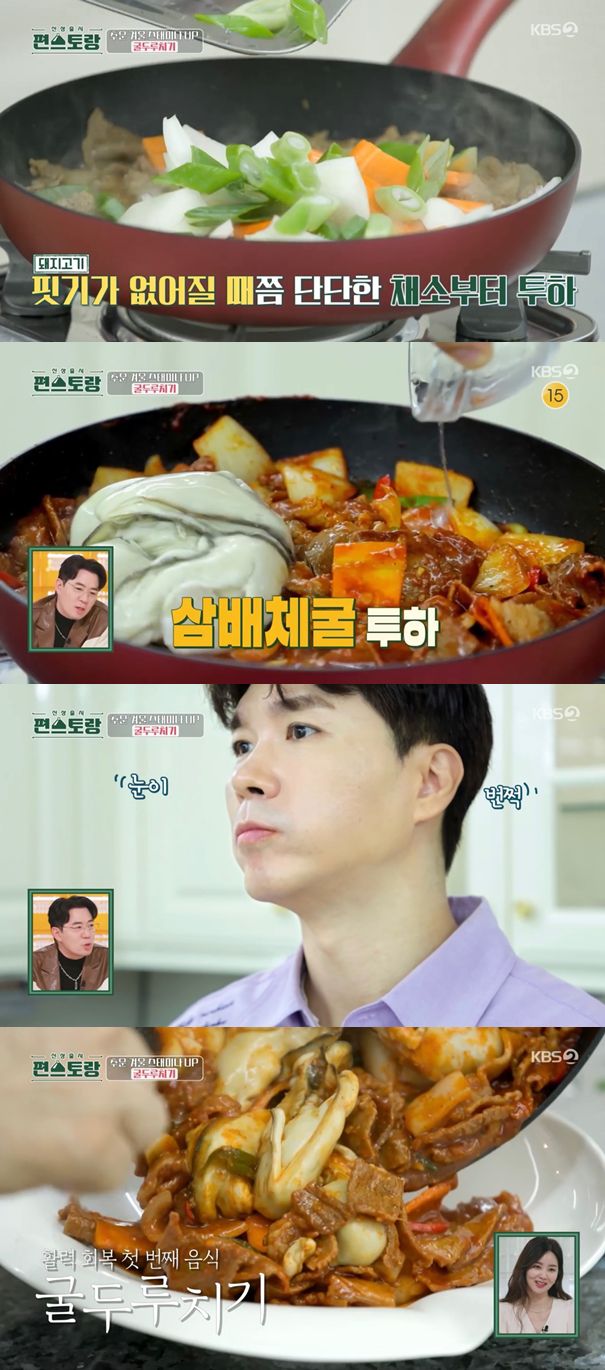 이어 박수홍은 굴 두루치기를 만들기 위해 목전지를 양념에 재워 각종 채소를 손질했다. 또 박수홍은 "양념의 포인트는 생강이다"라며 고춧가루, 물엿, 맛술, 다진 마늘 등과 더불어 생강을 듬뿍 넣었다.