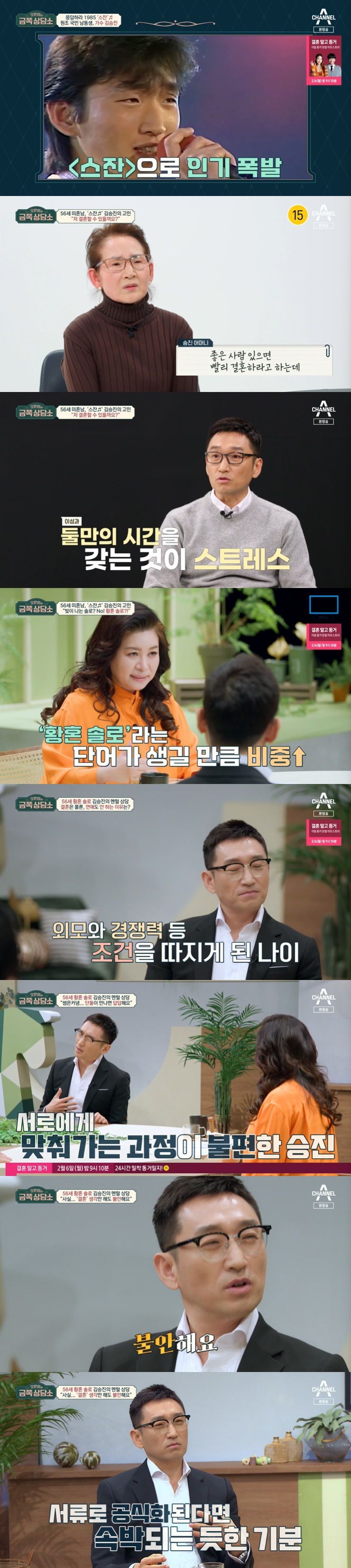 이날 김승진 어머니가 등장해 아들의 결혼 얘기를 꺼냈다. "좋은 사람 있으면 결혼해서 살라고 하는데 음악이랑 결혼했다고, 더이상 말하지 말라 하더라"라며 서운해 했다. 김승진은 "했던 말 또 하니까 그게 귀찮더라"라고 솔직히 털어놨다. 그러면서 "이성과 단둘이 만나는 게 힘들다. 단체로 보면 괜찮다. 둘이 만나는 게 불안하고 힘들고 스트레스가 많다"라고 했다.