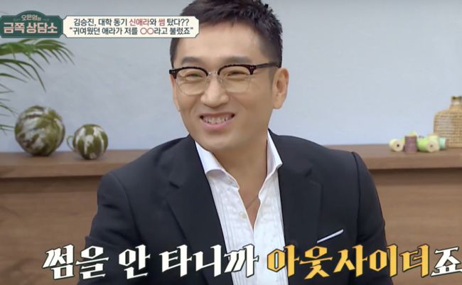 또 당대 최고 청춘스타 신애라와 대학동기라는 김승진은 “애라 되게 귀여웠다 스케줄로 출석만 했던 시절, 동기들과 함께 하지 못하니 신애라가 아웃사이더냐고, 어울리지못하니 먼저 다가와줬다”면서 “신애라 동료들에게 인기 많았다”고 했다. 혹시 썸이 있었는지 묻자 김승진은 “(내가)썸을 안 타니까 아웃사이더”라며 접점이 전혀 없던(?) 시절을 떠올렸다.