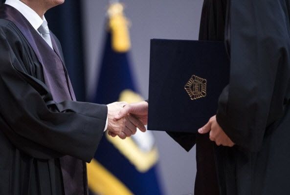 2018년 11월 대법원에서 열린 신임 법관 임명식에서 대법원장이 신임 법관에게 임명장 수여 후 악수를 하고 있다. (사진=연합뉴스)