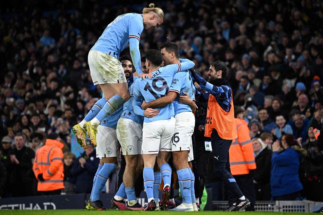 엘링 홀란(맨왼쪽) 등 맨체스터 시티 선수들이 28일 오전(한국시간) 아스널과의 2022~2023 잉글랜드축구협회(FA)컵 4라운드에서 후반 19분 네이선 아케의 골이 터지자 기쁨을 나누고 있다. 맨체스터|AFP 연합뉴스