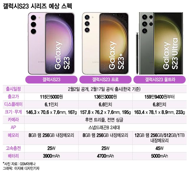 삼성전자가 상반기 최고 기대작 갤럭시S23 시리즈를 내주 공개한다. 전작의 단점을 보완한 동시에 삼성의 최신 기술이 집적된 역대급 스펙으로 출시된다. 이번에도 최상위 모델에 S펜을 탑재해 단종된 갤럭시노트를 계승한다. 다만 부품값 인상으로 가격은 전작 대비 15만원가량 오를 전망이다.