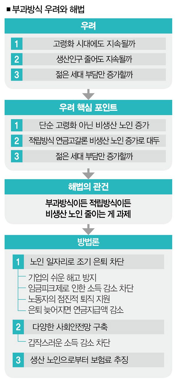 "맞습니다. 달리 말하면 이런 문제를 해결하지 않으면 적립방식의 연금재정 고갈론도, 부과방식의 부담 집중도 해결되지 않습니다."