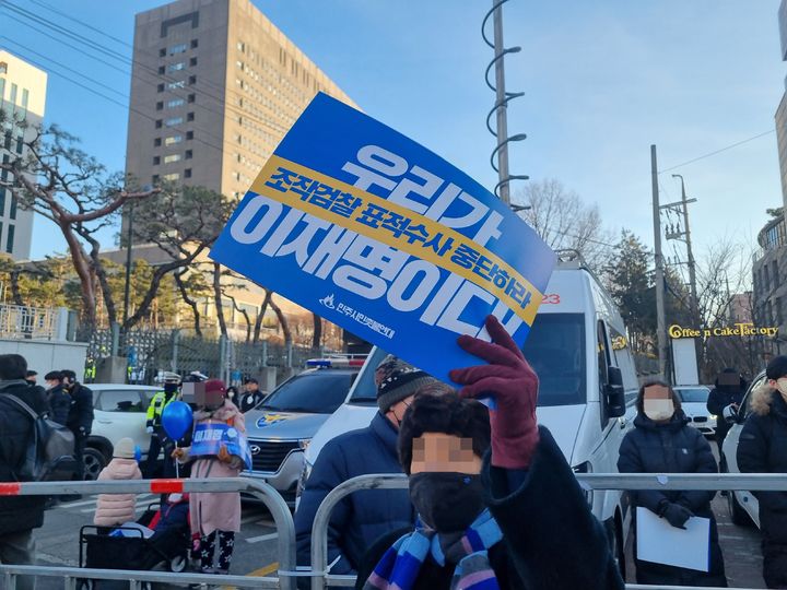 이 대표 지지자 여성은 "이 대표님께 힘을 주고 싶어서 왔다"며 "대표님이 조사를 마치고 나올 때까지 열심히 응원할 것"이라고 말했다. 그는 건너편에서 이 대표를 규탄하는 보수단체 회원들을 향해 "나쁜 사람들"이라고 했다.