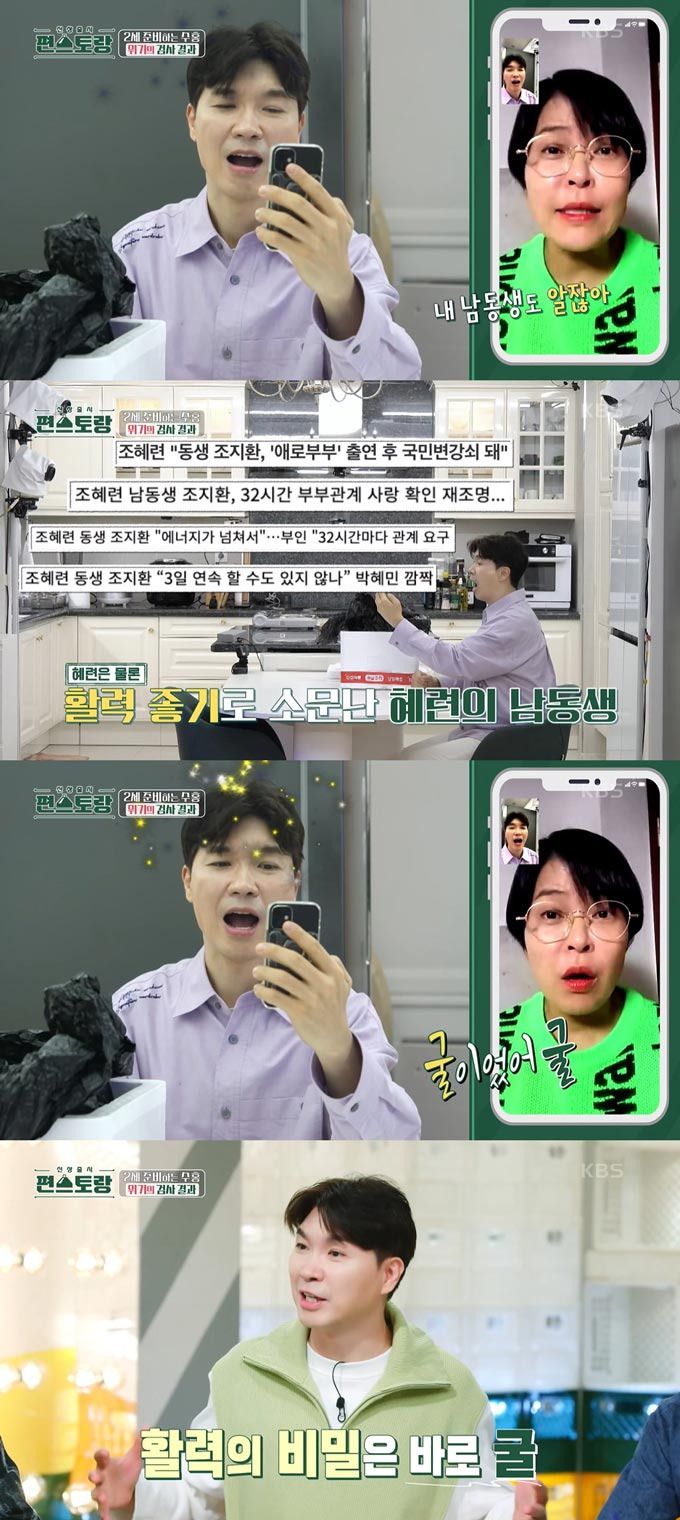 스튜디오에서 이를 지켜보던 가수 이찬원은 조혜련 동생인 조지환 부부가 출연했던 채널A 예능 프로그램 '애로부부'를 언급하며 웃음을 터뜨렸다. 이에 박수홍은 "저 집안이 굴로 남자들 힘을 키워줬다고 한다"고 너스레를 떨었다.