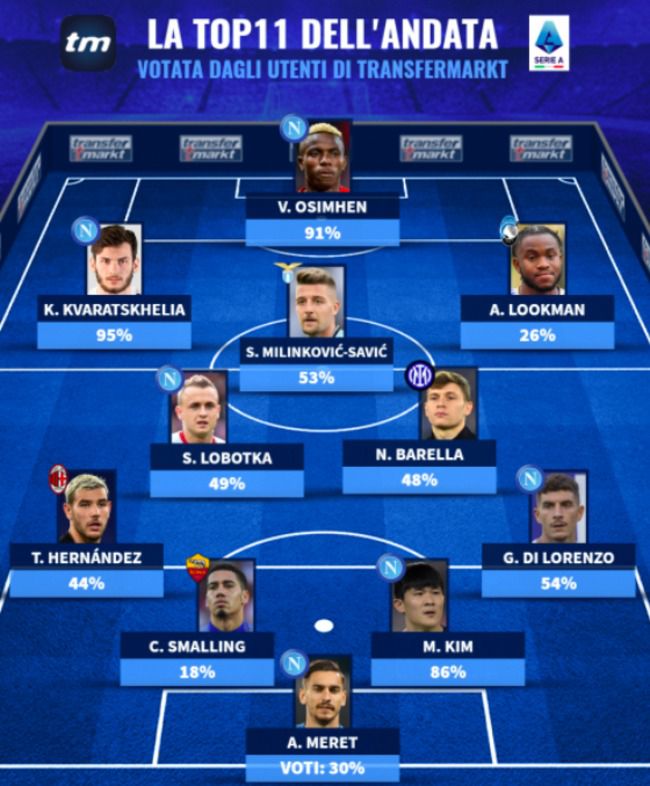 미드필더 3명은 흐비차 크바라츠헬리아(95%), 세르게이 밀린코비치 사비치(53%), 아데몰라 루크만(26%)가 차지했다. 먼저 나폴리에서 오시멘과 함께 공격의 주축으로 활약 중인 크바라츠헬리아는 올 시즌 나폴리로 이적한 뒤 세리에A에서 7골 9도움을 올리며 에이스로 자리매김했다.