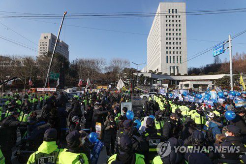 (서울=연합뉴스) 신현우 기자 = '위례·대장동 개발 의혹'과 관련해 더불어민주당 이재명 대표가 검찰에 출석한 28일 오전 서울 서초구 서울중앙지방검찰청 서문에서 이 대표 지지자들이 집회를 하고 있다. 건너편에는 이 대표를 규탄하는 집회가 벌어지고 있다. 2023.1.28