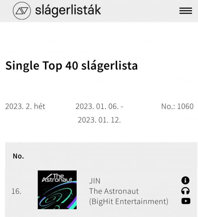 진의 'The Astronaut'은 발매와 동시에 헝가리 차트 1위에 올랐으며, 총 5주의 1위를 기록했다.