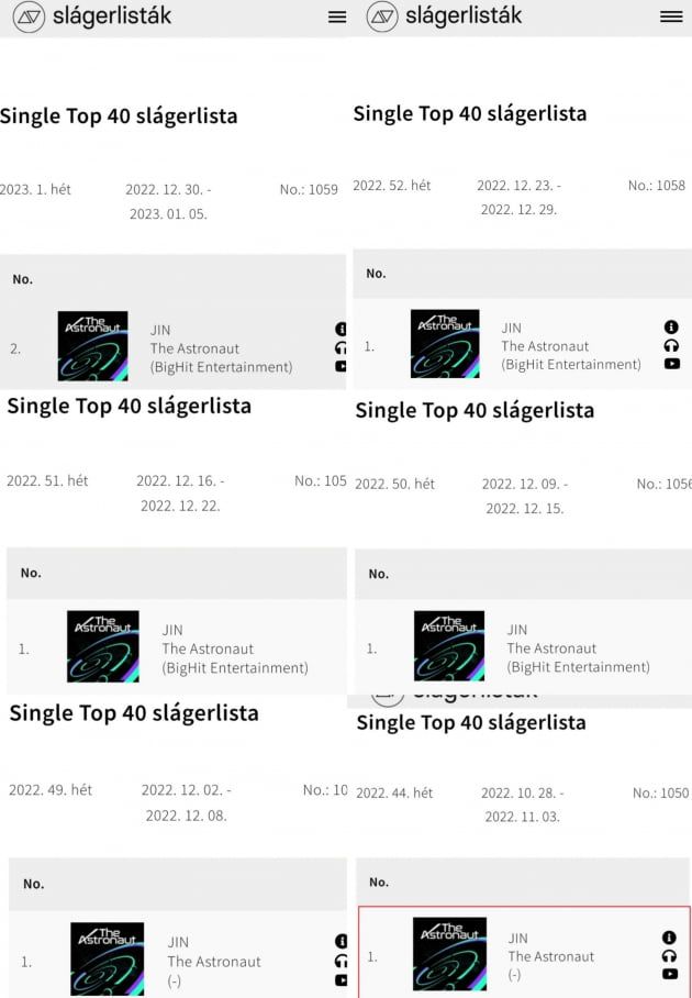 이로써 진은 헝가리 차트에서 최장 연속 1위와 최장 1위에 등극한 최초이자 유일한 아시아 솔로 아티스트가 됐다.