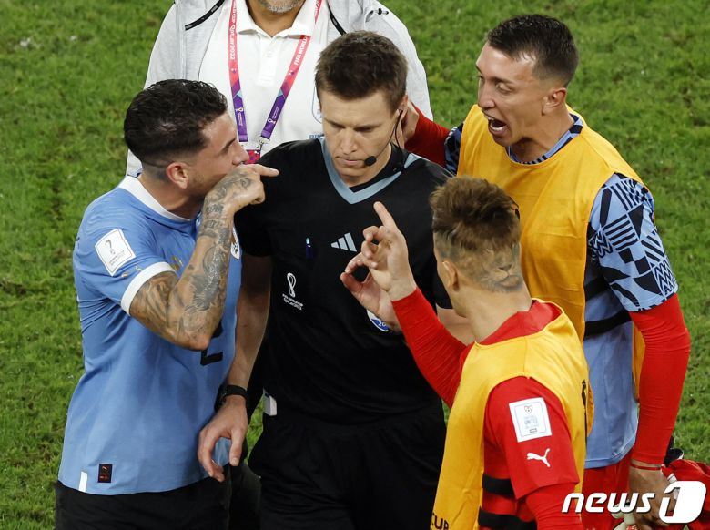 우루과이 선수들이 2022 카타르 월드컵 조별리그 탈락이 확정된 후 심판에게 거칠게 항의하고 있다. ⓒ 로이터=뉴스1