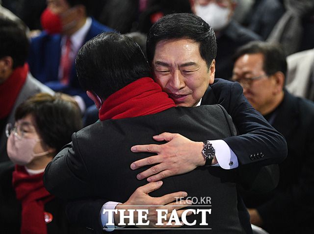 국민의힘 당권주자인 김기현 의원(오른쪽)이 28일 오후 경기도 부천시 중동 부천체육관에서 열린 '이기는 김기현 캠프 수도권 통합 출정식'에 참석해 배현진 의원과 포옹을 하고 있다. |