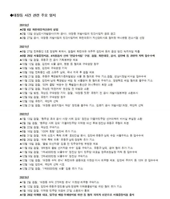 당시 성남시장으로서 최종 결재권자였던 이 대표의 개입·승인 여부를 확인하고자 검찰은 100장 넘는 질문지를 준비했다. 이 대표가 민간사업자들에 특혜를 주는 대가로 대장동 수익 24.5%를 나눠 갖기로 약속받았다는 의혹, 측근을 통해 민간업자로부터 선거 자금 등을 받았다는 의혹 등에 대한 내용이 포함된 것으로 보인다.