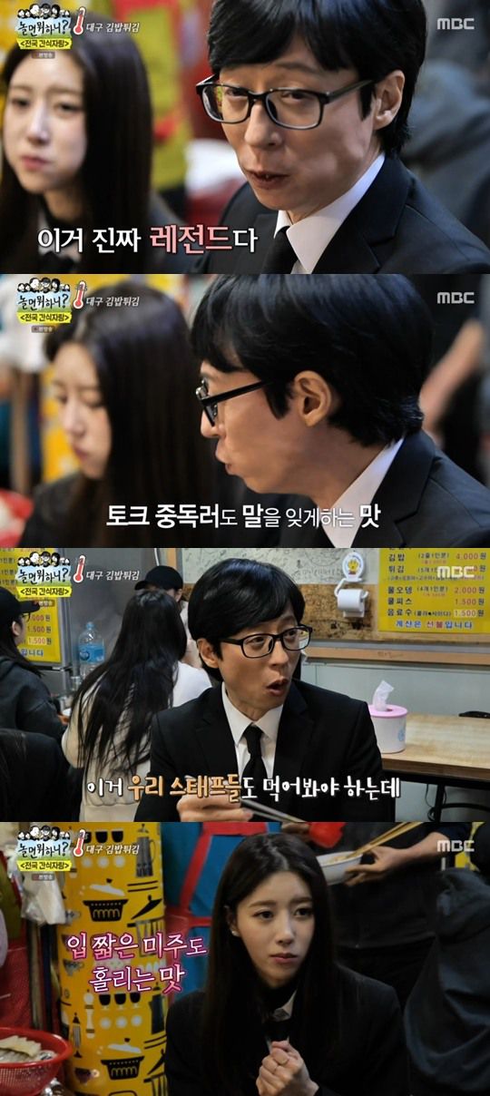 평소 토크가 많기로 유명한 유재석은 갓 튀긴 김밥튀김을 떡볶이 소스에 버무려 먹고 난 후 "안 들어갈 줄 알았는데 들어간다, 왜 이걸 추천해주셨는지 알겠다" 며 토크를 일시 중단했다. 이미주는 연신 "이건 레전드다 레전드" 라고 외치며 야무지게 김밥튀김 먹방을 이어갔다. 이미주는 "그냥 김밥을 떡볶이 소스에 찍은 거랑 김밥튀김을 떡볶이 소스에 찍어먹는 거랑 다르다" 며 감탄을 멈추지 못했다.