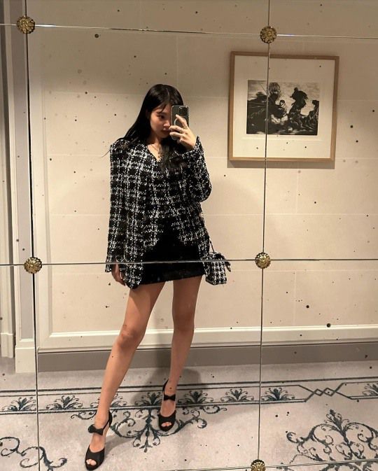 공개된 사진 속에는 제니가 셀카를 남기고 있는 모습이 담겼다. 특히 미니스커트로 투피스룩을 완성한 제니는 군살 하나 없이 늘씬한 각선미까지 인증하며 화려한 미모를 자랑했다.