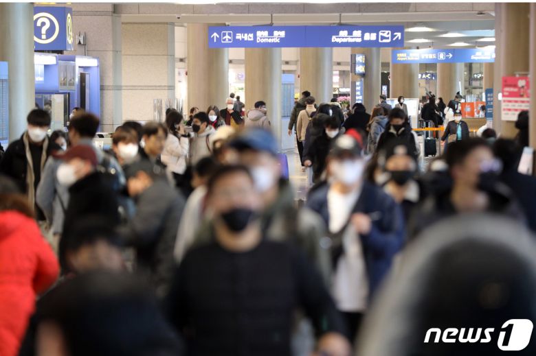 정부가 실내 마스크 착용 의무 해제 결정을 발표한 20일 인천국제공항 입국장에서 마스크를 착용한 승객들이 이동을 하고 있다. 2023.1.20/뉴스1 ⓒ News1 황기선 기자