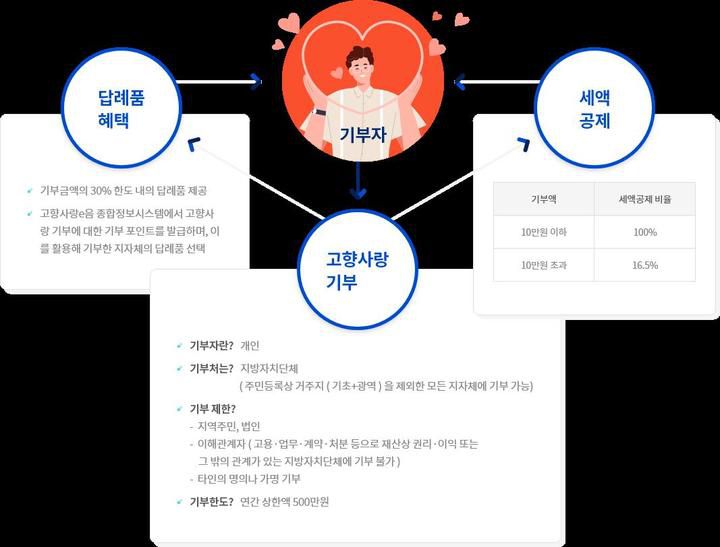 국내 거주 개인이 주소 등록지가 아닌 지자체에 연간 최대 500만 원 한도에서 기부하면 금액에 따라 세액 공제 혜택과 답례품을 받을 수 있는 제도다.