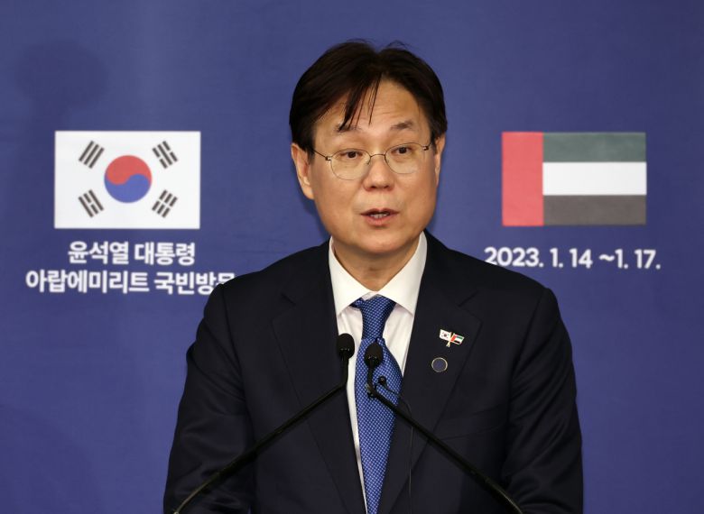 대통령실 이관섭 국정기획수석이 15일(현지시간) 아랍에미리트(UAE) 아부다비의 그랜드 하얏트 호텔에 마련된 프레스센터에서 한-UAE 정상회담 결과 브리핑을 하고 있다. [연합]