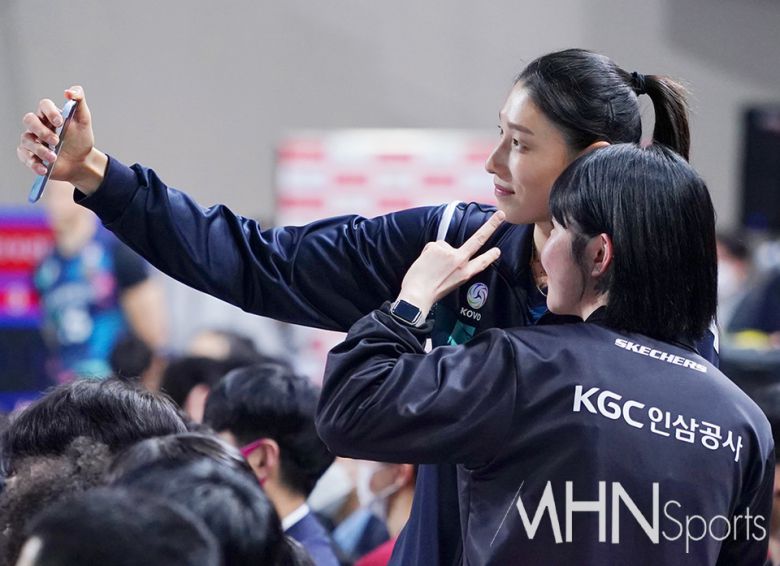 이날 M스타 김연경이 KGC인삼공사 통역과 사진촬영을 하고 있다.