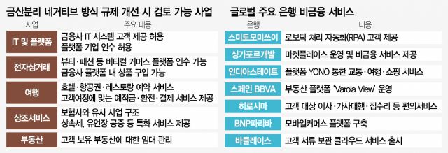 해외 금융사들은 이런 생활 밀착형 서비스를 이미 선보이고 있다. 앞선 DBS의 마켓플레이스가 대표적이며 인도 최대 상업은행인 인디아스테이트은행(SBI)은 YONO(요노)라는 자사 플랫폼을 통해 글로벌 e커머스 업체인 아마존 등100여 개 협업사에 응용 프로그램 인터페이스(API)를 제공하는 방식으로 교통, 여행, 온라인 쇼핑 등 비금융 서비스를 제공하고 있다. 또 스페인 은행인 BBVA는 자체 부동산 플랫폼을 통해 부동산 정보 서비스와 이와 연계한 모기지 자문 서비스를 제공하고 있으며 일본 히로시마은행은 고객을 대상으로 이사, 가사 대행, 집 수리 등 각종 생활 편의 서비스를 제공하고 있다. 국내 카드사의 한 고위 관계자는 “규제 때문에 은행은 고객 예금으로 돈을 빌려주고 이자를 받아 챙기는 ‘이자 놀이’만 하고 있다는 비판을 받는다”며 “예대금리 차익에만 기대서는 금융회사가 성장하고 발전하기에 한계가 있다”고 지적했다.